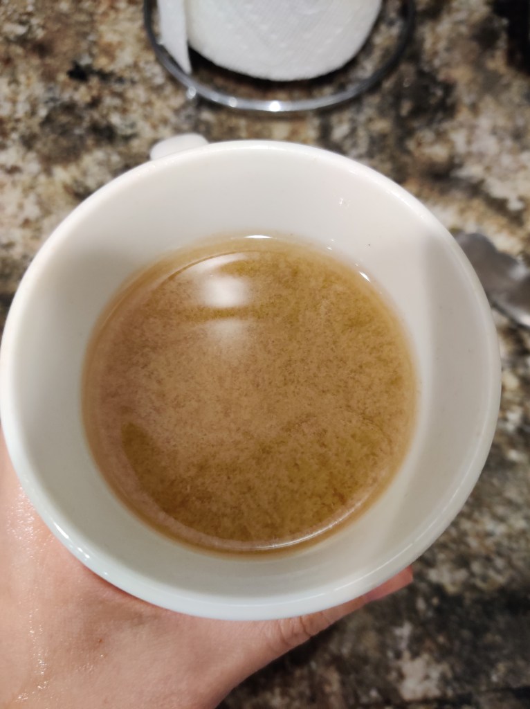 Interestingly enough, the clear juice did turn a little foggy – more like cider looking. I did have to keep stirring it as I drink, so it makes me wonder if I should’ve heated everything longer and if that would’ve made everything mix better. Next time! Also, sorry for the boring pic – I had a bit of an accident attempting to get it (you can see the splash on my hand), so boring it is!